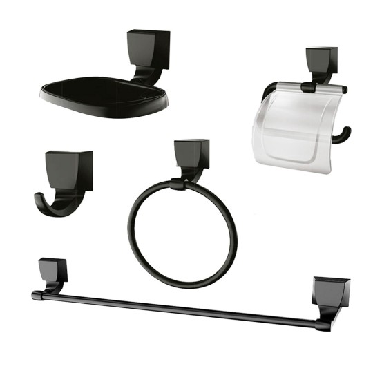 O Kit contém: 1 Saboneteira. 1 Papeleira. 1 Toalheiro Barra. 1 Toalheiro Argola. 1 Cabide. 10 parafusos e buchas para fixação.