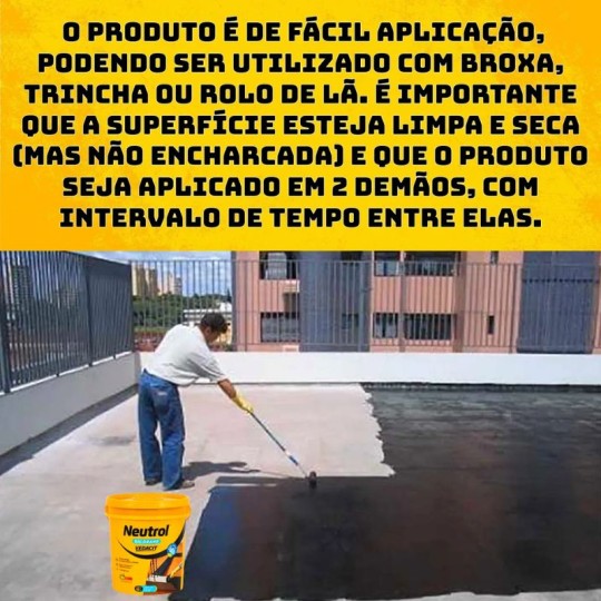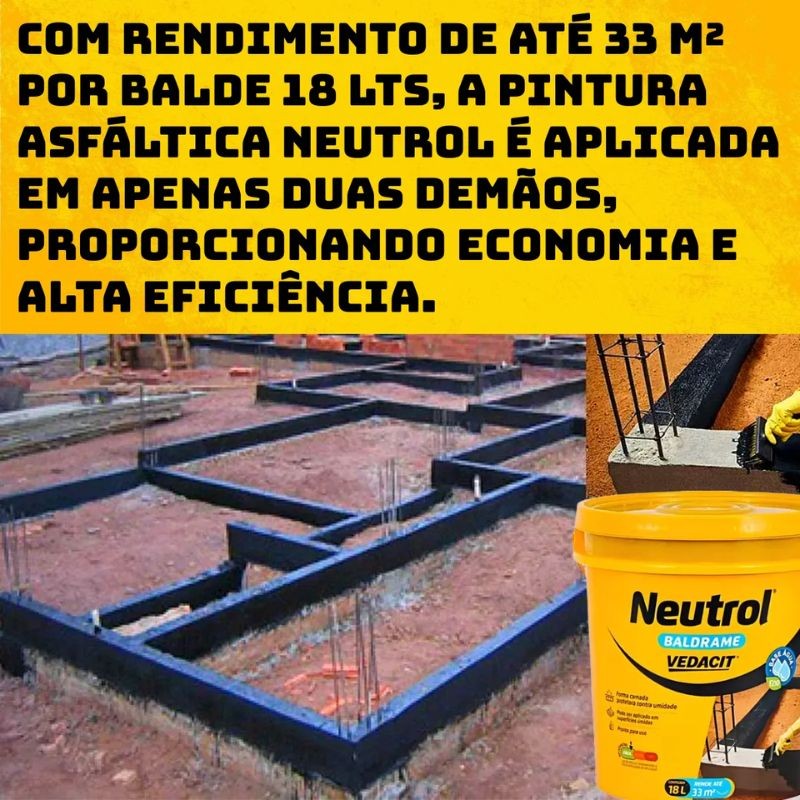 NEUTROL BALDRAME: é uma emulsão asfáltica que forma uma película impermeável. É indicado para impermeabilização e proteção de baldrames que ficam em contato com o solo sujeito a águas e aos meios agressivos. Apresenta secagem rápida entre as demãos. Por apresentar baixo teor de COV (Compostos Orgânicos Voláteis), reduz a quantidade de contaminantes do ar, contribuindo para a preservação do meio ambiente.