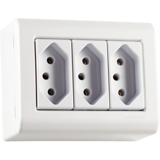 Mais qualidade na hora de ligar seus equipamentos elétricos, você tem com a Caixa de Sobrepor com 3 Tomadas 2P+T 20 A 250 V Tramontina LizFlex Branca. Perfeita para quem busca o melhor para seus projetos, ela proporciona rapidez e flexibilidade em suas obras, já que sua instalação fica perfeita e não demanda transtornos como quebras de paredes e dispensa o uso de parafusos. Ela é fabricada em termoplástico na cor branca e é composta por caixa, tampa com encaixe de pressão e o módulo. Além de contar com sistema modular, possui janelas para inserir canaletas de diferentes dimensões. Com a Tramontina, você tem a garantia de espaços funcionais e cheios de estilo!