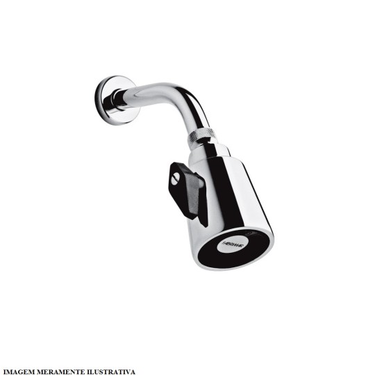 Chuveiro de parede com crivo redondo e jato regulável. através de uma alavanca que faz com que o jato saia mais aberto ou mais fechado. Acabamento superficial cromado. Crivo móvel.