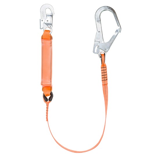 Talabarte de segurança simples em fita poliéster plana de alta resistência com absorvedor de energia. Conector classe A em aço com abertura de 55 mm e conector classe T em aço com abertura de 20 mm.