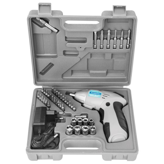 -Acompanha: maleta para transporte; carregador bi-volt; adaptador para soquetes; 8 soquetes sextavados 6. 7. 8. 9. 10. 11. 12 e 13 mm; adaptador de bits 55 mm; 5 bits ponta chata 3. 4. 5. 6 e 7 mm; 7 bits hexagonais 5/64". 3/32". 1/8". 9/64". 5/32". 3/16" e 1/4"; 4 bits ponta cruzada PH 0. PH 1. PH 2 e PH 3; 4 bits ponta trafix pozidrive PZ 0. PZ 1. PZ 2 e PZ 3; 8 bits trafix T10. T15. T20. T25. T27. T30. T40 e T45; 2 bits longos ponta chata 4 e 6 mm; 4 bits longos ponta cruzada PH 00. PH 0. PH 1 e PH 2; manual de instruções.